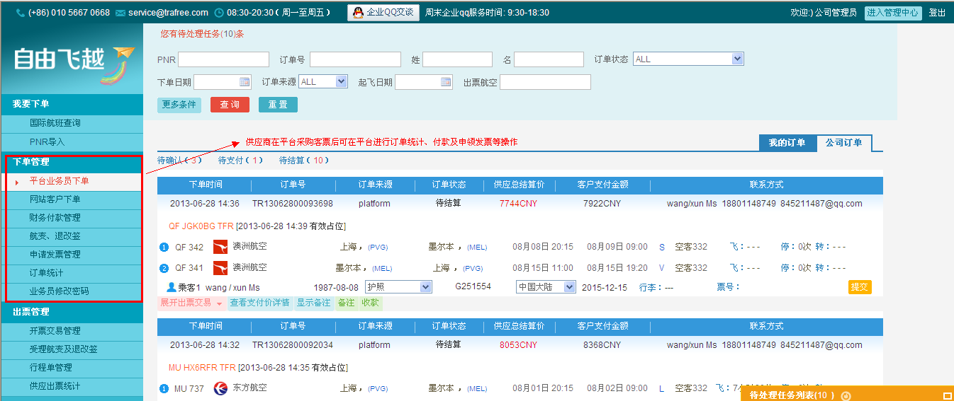 进入后台订单管理后,可点击左侧红色线框内的任一项,Trafree供应商可对其在Trafree平台采购的客票进行统计、付款及申请发票等操作。