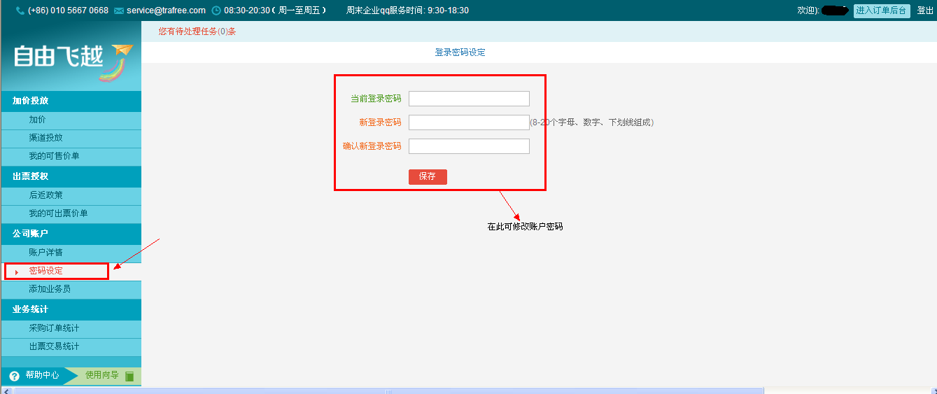 登录账户后,点击左侧红色线框内的“密码设定”可修改供应商在Trafree平台的登录密码。